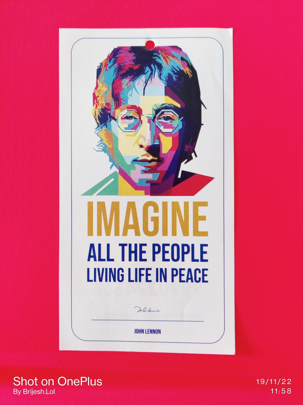 This is a photo of John Lennon. This colorful photo was shot on OnePlus 8T by Brijesh. This colorful photo of John Lennon has his autograph signature too.